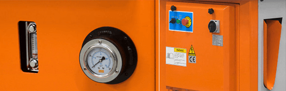Станок оснащен гидравлическими тисками. На основной панели расположены: цветной сенсорный дисплей, с помощью которого можно задать программу и отслеживать процесс пиления, регулятор скорости опускания пилы и кнопка аварийного останов