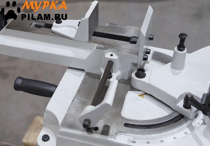 • Удобная, быстро перестраиваемая система регулировки позволяет с минимальными потерями времени переходить на пиление различных размеров под разными углами -45° 0° +45° +60° (для работы с заготовками под углом минус 45° необходимо сместить тиски).