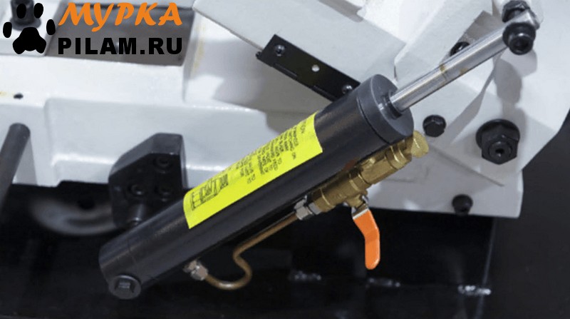 - На станках с гидроразгрузкой управление и процесс резки (запуск пилы – опускание рамы – остановка пилы) происходит за счёт запуска двигателя и регулировки гидроцилиндра. Гидроцилиндр имеет переключатель вкл./выкл. гидравлической системы и плавную регулировку опускания рамы верхним маховиком на дроссельном клапане.