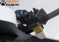 - Пильную раму возможно установить в вертикальном положении - для резки небольших изделий из дерева, пластмассы и других заготовок из мягких материалов (для которых не требуется фиксация в тисках во время пиления), при этом станок обязательно должен крепиться к полу. В стандартной комплектации имеется небольшой стол для ручной подачи заготовок, который крепится к раме в вертикальном положении.