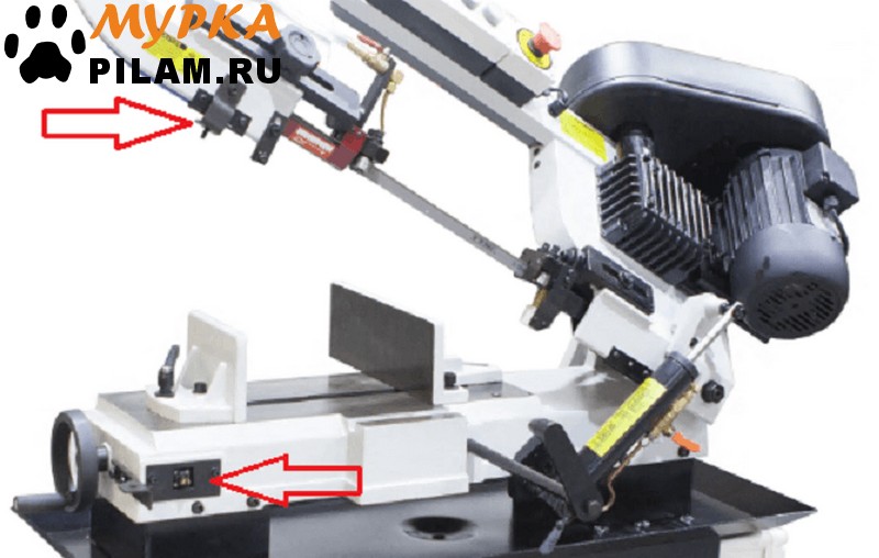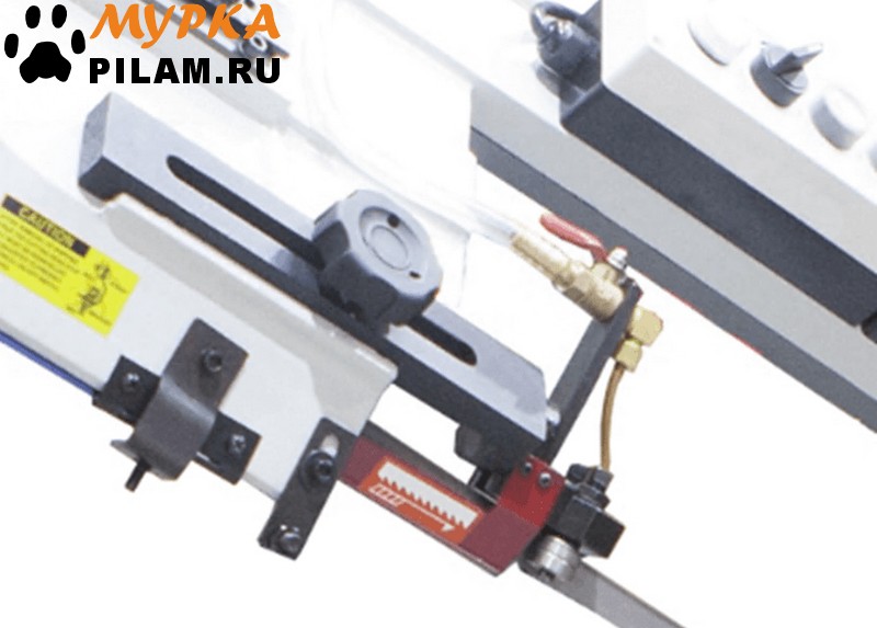 - На станках с гидроразгрузкой управление и процесс резки (запуск пилы – опускание рамы – остановка пилы) происходит за счёт запуска двигателя и регулировки гидроцилиндра. Гидроцилиндр имеет переключатель вкл./выкл. гидравлической системы и плавную регулировку опускания рамы верхним маховиком на дроссельном клапане.