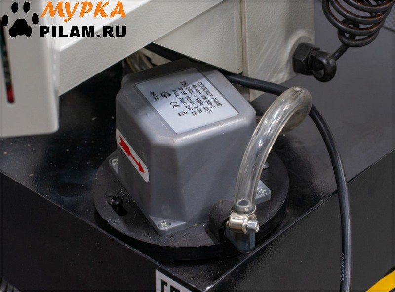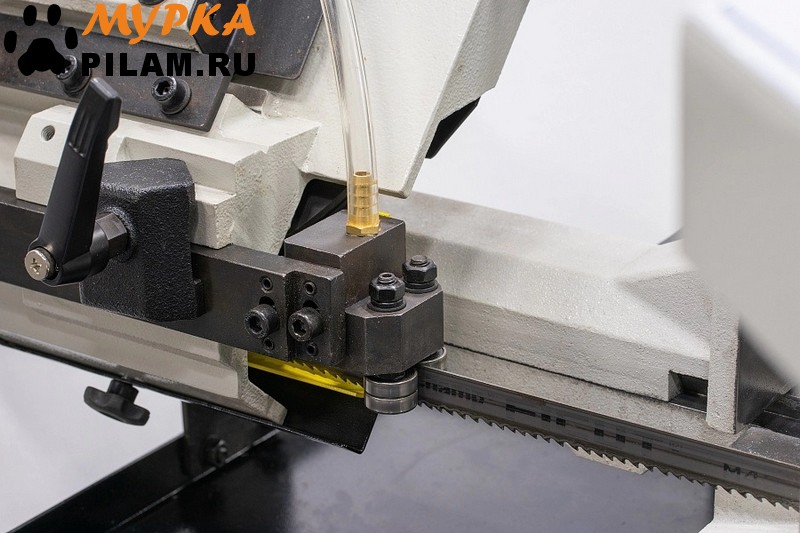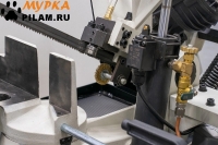 Модель имеет быстрорегулируемые тиски для резки под углом, поворачивается рама, а не заготовка. Тиски с системой быстрого отвода ускоряют процесс смены заготовки (ускоренный отвод подвижной губки происходит без вращения маховика). Зажим заготовки осуществляется тисками вручную, подача заготовки - также вручную. Наличие системы СОЖ в стандартной комплектации – позволяет добиться высокой производительности.