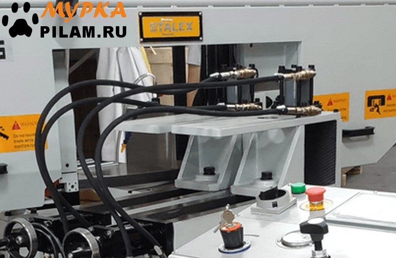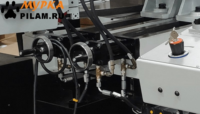 Станок оснащен гидравлическими тисками с возможностью быстрого зажима заготовок. Помимо гидравлического зажатия, тисков имеют механический ход тисков. На основной панели расположены: цветной сенсорный дисплей, с помощью которого можно задать программу и отслеживать процесс пиления, регулятор скорости опускания пилы и кнопка аварийного останова.