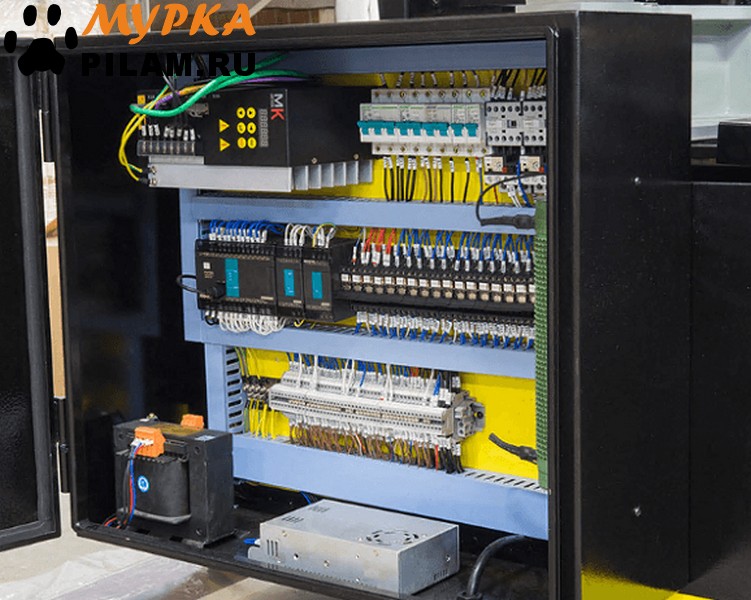- Панель управления выведена консолью к станку, для удобства оператора. Длина подачи заготовки контролируется автоматически c ЧПУ (СNC). ЧПУ станка строится на PLC контроллере.