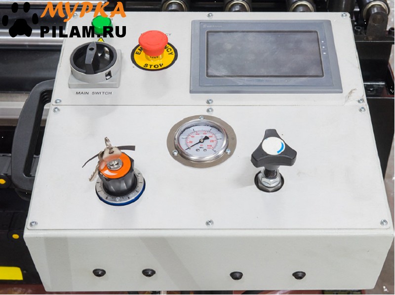 - Панель управления выведена консолью к станку, для удобства оператора. Длина подачи заготовки контролируется автоматически c ЧПУ (СNC). ЧПУ станка строится на PLC контроллере. Сенсорный дисплей управления. Станок оснащён серводвигателем для плавной регулировки скорость вращения полотна 0-100 м/мин (без цифровой индикации).