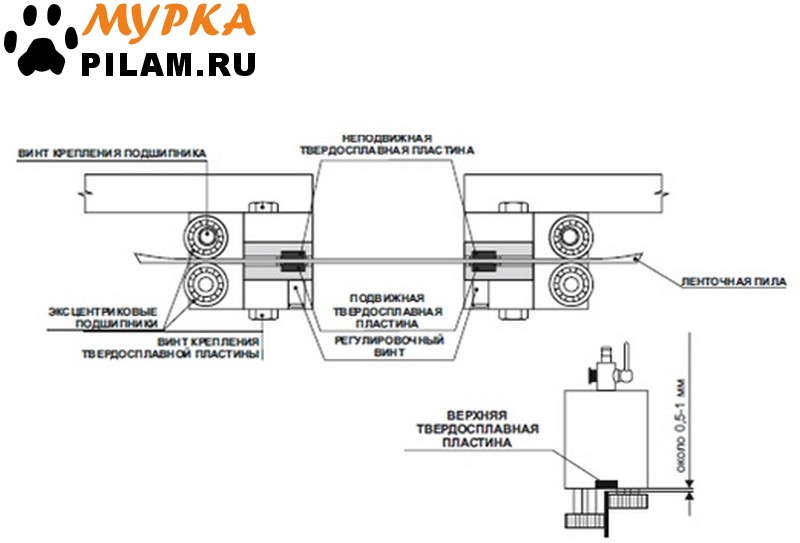 Использование в станке шкивов большого диаметра и трехсторонних твердосплавных направляющих пилы увеличивает многократно стойкость инструмента и точность распила;