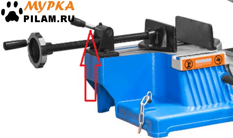 - Ручное натяжение полотна. Нижним положением рычага достигается правильное натяжение ленточной пилы