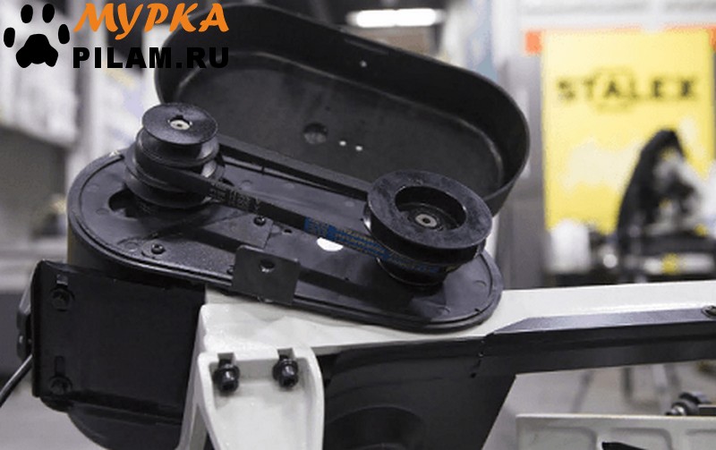 Станок оснащен ременной передачей, поворотными тисками с углом наклона 45-90 градусов, устойчивой конструкцией с транспортировочными колесами, ограничителем длины реза, регулировкой натяжения пильного полотна, дополнительным столом при резке плиты в вертикальном положении рамы.