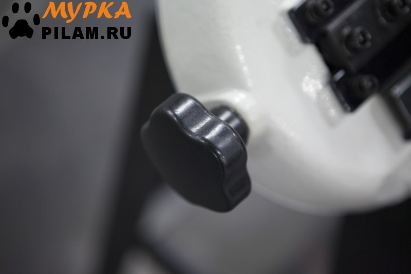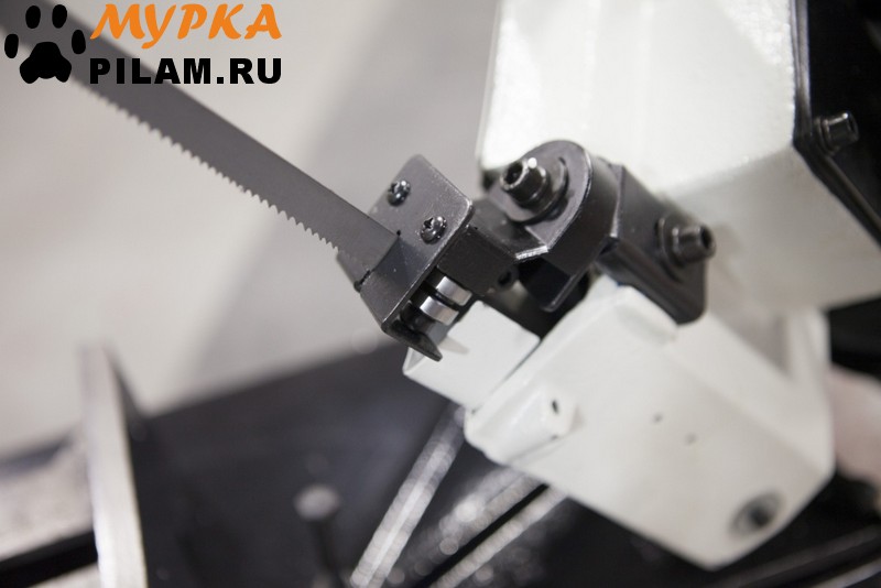 Данная модель оснащена стационарными тисками, для резки под углом, поворачивается рама, а не заготовка. Зажим заготовки осуществляется тисками вручную, за счет вращения маховика, подача заготовки - также вручную.