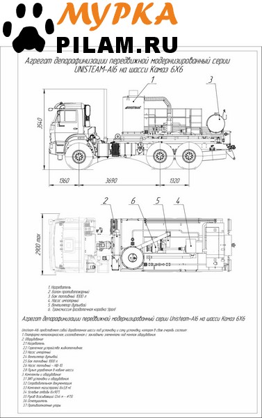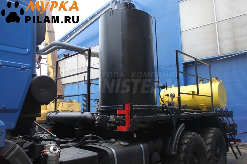 Основой установки служит мощный котел, обеспечивающий максимальное давление и производительность. Производительность парогенератора измеряется в кубах пара в минуту. Специальной защитой предусмотрена надежность работы при любых условиях. Для удобства водителя предусмотрено спальное место, что делает работу на дальних маршрутах более комфортной. Установлены системы защиты двигателя и КМУ, обеспечивающие долговечность эксплуатации.
