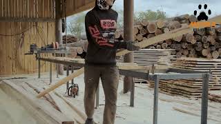 Пильный узел оснащен двумя электродвигателями по 7,5 кВт. И дисковые пилы диаметром 500 мм обеспечивающие толщину пропила до 100 мм Расстояние между пилами регулируется вручную при помощи винтовой передачи. Дисковые пилы сводятся-разводятся от центра станка, таже имеется возможность фиксации одной пилы в постоянном положении. Подача каретки вдоль заготовки осуществляется вручную.