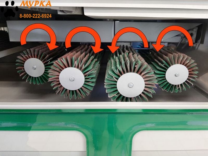 7) Станок с двумя шлифующими узлами (абразивная щетина + наждачка) позволяет шлифовать негрунтованную и грунтованную поверхность за один цикл до 100%, чего нельзя добиться от одноузлового станка. Первый узел вычищает труднодоступные углубления мелкой фрезеровки и производит браширование поверхности (поднимает слабые слои материалов). Второй узел шлифует наклонные и горизонтальные грани. Качество шлифовки зависит от: